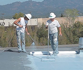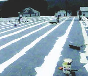 A unique system that waterproofs with a seamless acrylic coating in which a tough, flexible fabric is embedded. This combination makes a rugged, yet lightweight membrane that resists splitting and rupturing - the primary cause of leaks. This system also substantially increases the strength of your roof, extends its life expectancy, and increases the energy efficiency of the building.